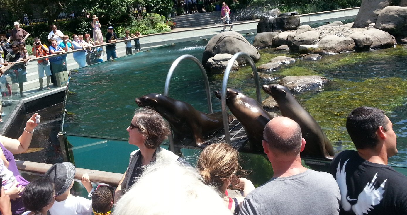 My one “true vacation” this summer, I’ve been out in NY visiting my parents in Katonah and my sister in NY. Here are the awesome sea lions of Central Park Zoo. A small zoo, just enough for one very hot afternoon in the sun. The sea lions knew it was feeding time, and were eager to do absolutely anything to get that fish in the mouth. They clapped at the audience, kissed their trainers, and climbed to the top of the highest rock. Sure beats eating squid and getting eaten by orcas, the general fate of sea lions wild and “free.”