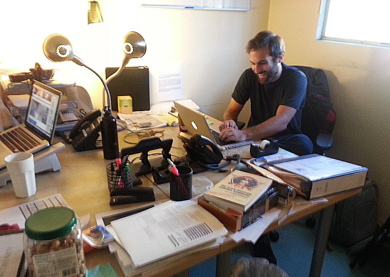 Thanks to David Brin‘s recommendation, I spent an unexpected weekend on interview for an upcoming episode of Alien Encounters. Produced by Karga7, this Science Channel show imagines an alien spaceship that lands on Earth to disperse a mysterious microbial substance. Minus the space ship, it sounds rather like The Highest Frontier. Above is Avi’s story board, and here is Scott’s desk in their church-basement LA studio.