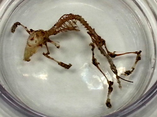 The skeleton of a mouse–a wild mouse, one of many that get in from the woods and scamper throughout our building. This hapless rodent must have fallen into the tank of fiddler crabs. The crabs made short work of it, picking the last bit of meat off the bones.