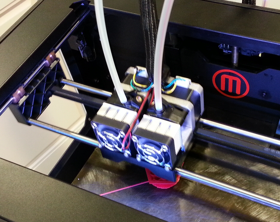 So this is the new MakerBot at Kenyon’s Science Complex. The blue-and-white thing looks blurred because it is vibrating so fast, printing out the pink polyedron. The pink stuff enters as a fiber of plastic down the right-hand tube, which comes from a coil of pink plastic behind. We plan to use this machine to make models of molecules and cells, along the lines of Brett Barney at Thingiverse.