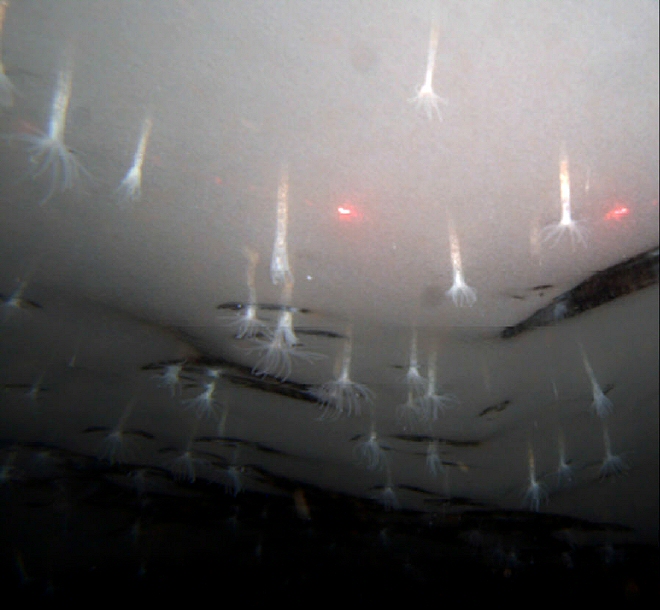 About an inch long, with two dozen tentacles, each anemone seeks its tiny dinner to strangle; in subfreezing temperatures, with no light (until the exporers came.) Marymegan Daly and colleagues found these tiny denizens of the dark by drilling a hole through all those meters of ice, in the Ross ice shelf. While blizzards rage above, these tiny creatures grow and multiply. One of the simplest of the animals, these creatures do come female and male; and the females bear eggs. And they react–when the remote camera approached, the tentacles drew back. The animals didn’t want to warm up; they clung fast to their ice. Life adapts, even to this remote niche so forbidding to most other forms.