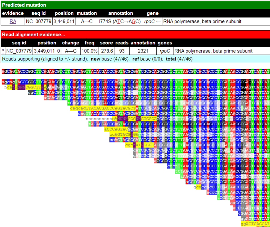 The topmost sequence is the published “reference” genome of a typical laboratory E. coli strain. If all the 250-mer pieces show a different base at one position, that suggests a mutation. Mutant varieties eventually get selected for or against. After 2000 generations (doublings) of E. coli, we found various strains that could grow faster than the ancestral strain; but only in acid. So now we’re testing the mutations in these strains to find out how certain genes help the acid-challenged bacteria.