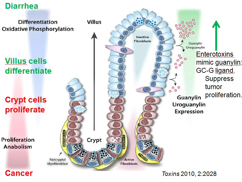 More recently, the basis of the cancer correlation was shown to be certain toxins emitted by the bacteria, called enterotoxins. These enterotoxins mimic the body’s own regulator molecules that cause cells of the intestinal lining to differentiate for digestion. These same toxins (and regulator molecules) down-regulate cell proliferation leading to cancer. It appears that humans evolved to depend on a certain chronic level of diarrhea-causing bacteria to suppress tumor formation in the colon. But now, pharmaceutical companies are working to design versions of the enterotoxin that maximize the helpful effects without unpleasantness.