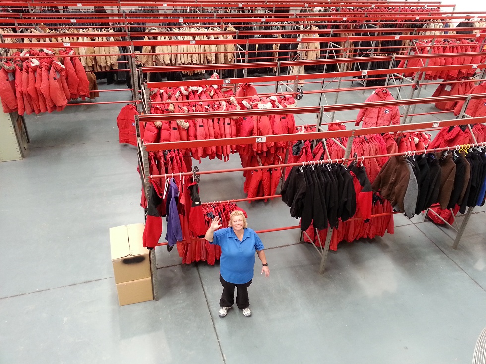 If you want to get yours, there’s a whole warehouse full here in Christchurch. That’s Marie waving, so come on over and pick your “big red” (sorry it sounds like Denison). I did spot one purple inner coat there. Anyway, they have every possible size of everything.