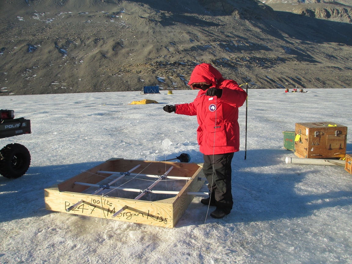 Today, after dozens of training videos, I finally joined our research team in the Dry Valleys–one of the most sensitive protected regions of Antarctica. Packed like sardines, our helo flies across the Ross ice, then up Taylor Valley, passing the Kukri Hills of the Antarctic desert. You can see how steep they are, and how the snow is thinning out. Glaciers surge down between the hills, then we reach frozen Lake Bonney. The white stuff is like frozen foam–hard as glass, vicious if you fall. Our camp appears below: the Jamesway, then the lab (green box-like thing).