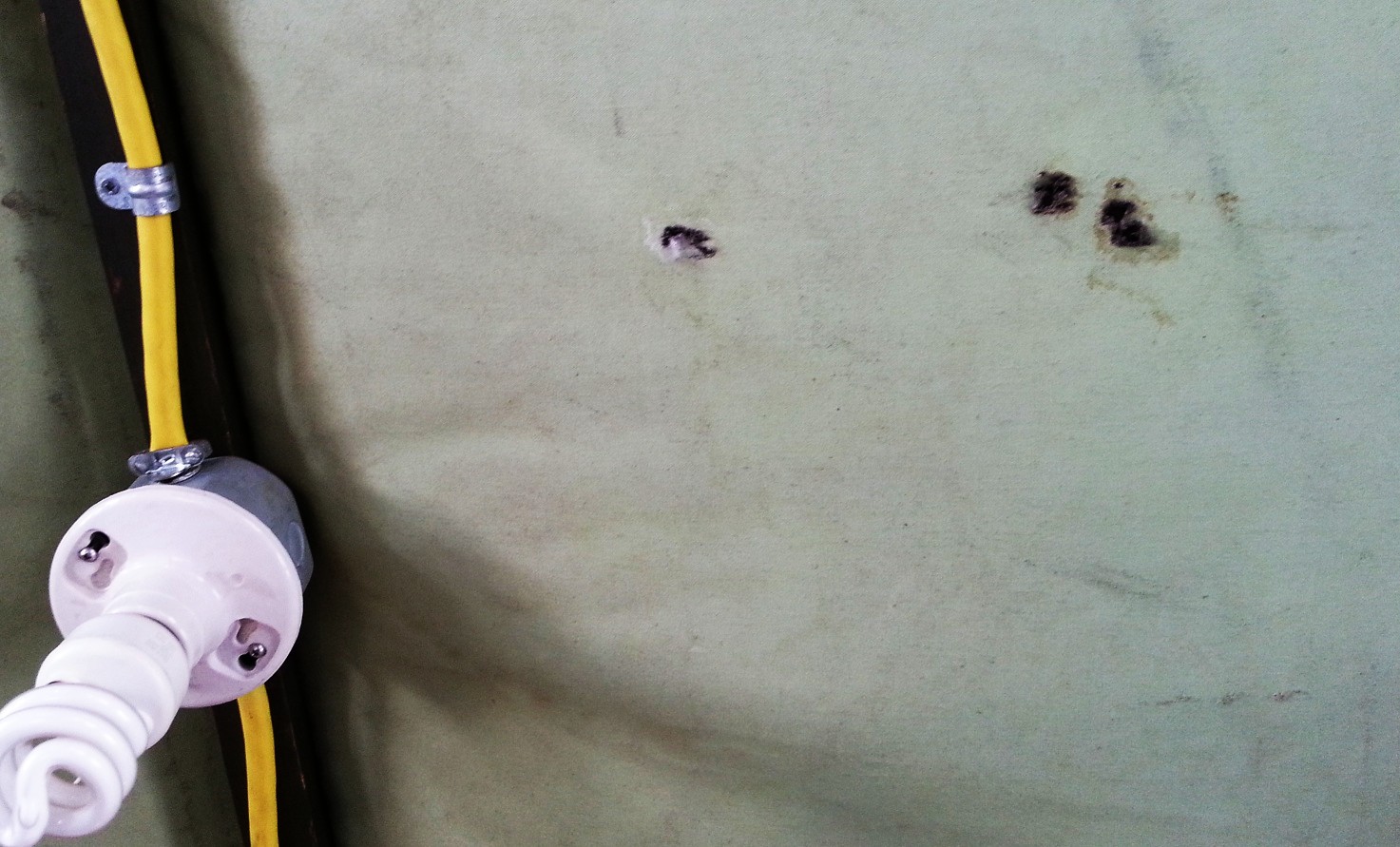 We know the hut saw action because the cloth ceiling still has bullet holes: