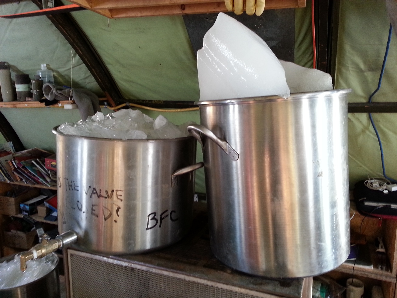 How do we get drinking water? We go up to the glacier and saw chunks of ice to thaw on the woodstove. The water for drinking gets filtered.
