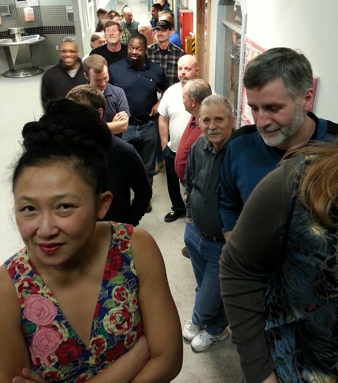 Thanksgiving is a special holiday. There are three seatings for a very special dinner. Here you can see people lining up for the 5:00pm seating.