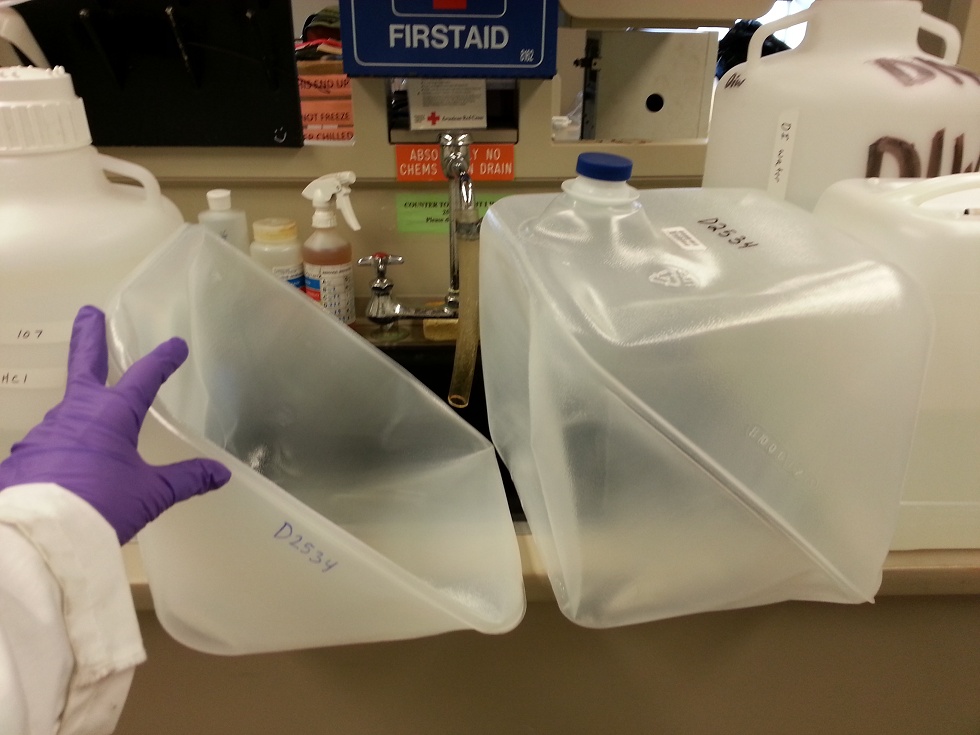 Michael does maintenance for Crary science lab. Here he meets with Neville, the boiler inspector. An important part of Michael’s job is feeding Neville lobster so that he’ll let the boilers pass inspection. If Neville fails the boilers, the whole station will go dark. Crary lab (which I’ll blog more about next week) requires all kinds of special maintenance. For instance, you need different kinds of water–the sink water, here, as well as de-ionized water. Keeping all the special plumbing straight is important here, just like at Kenyon where Dave Boughter does it. This photo shows the “cubitainers” for lake water collection, which I’m bringing out to the Dry Valleys today (weather permitting). The cubitainers are cubical plastic containers that cleverly pack half-inside-out, for transport. However, even the fresh plastic contains impurities that we have to wash out with acid and deionized water, before collecting lake samples.