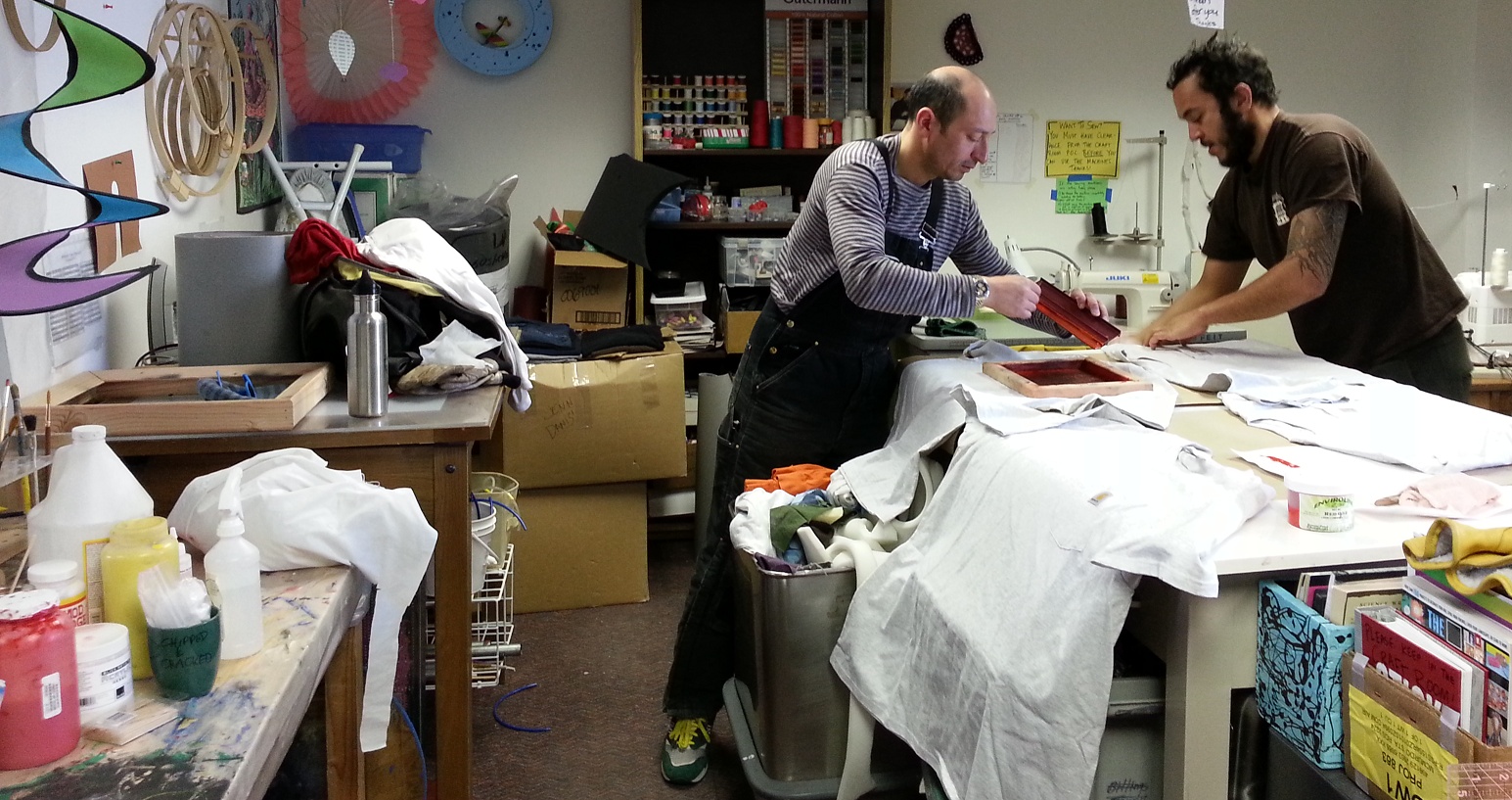 Thanks, Greg, Claire, Brent, and Isaac! Here are Manuel and Karsten, in the craft room. On their own time, they are making T-shirts for the Thanksgiving night party (see below).