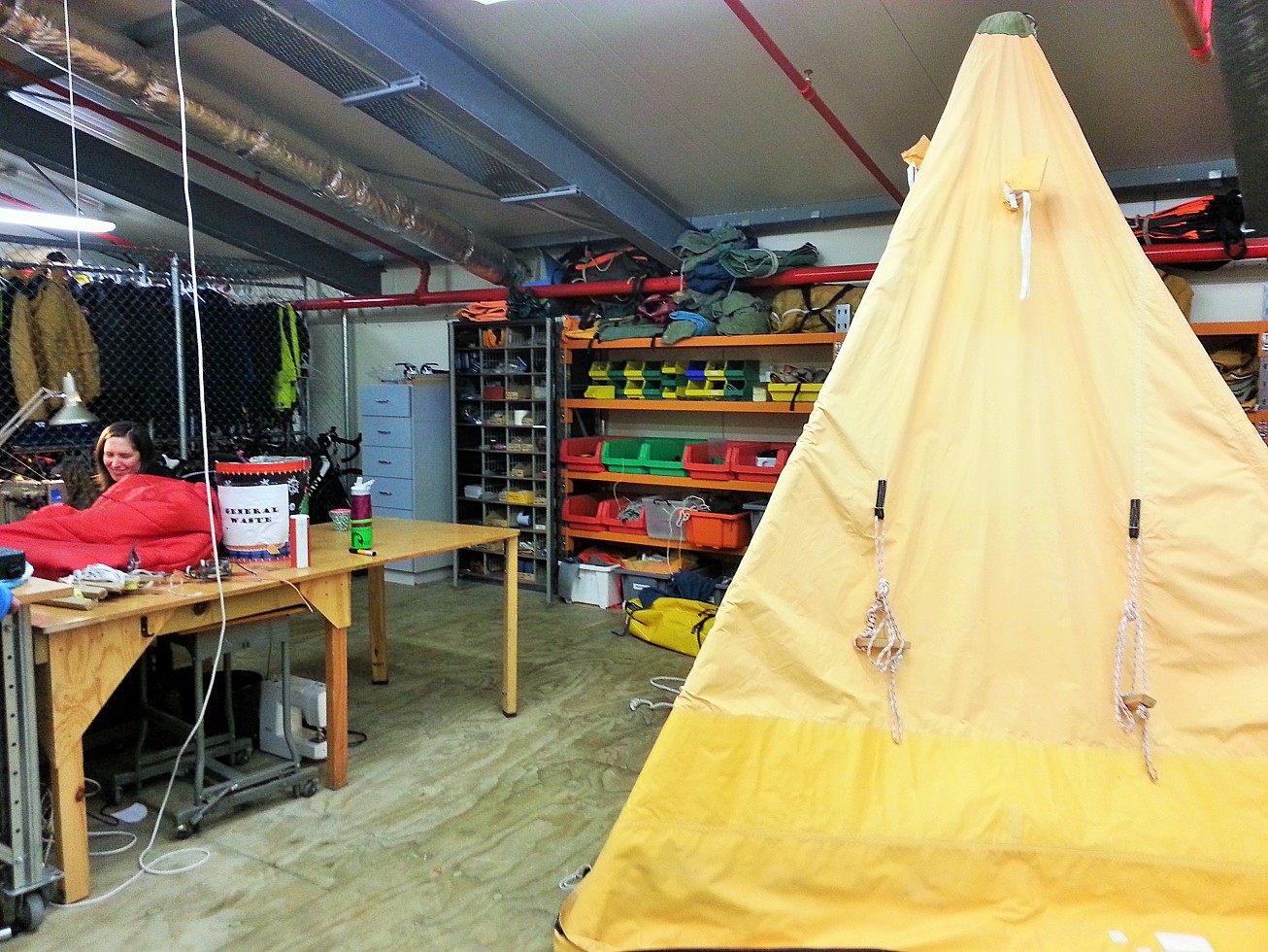 In the gear supply, Amanda is sewing a sleeping bag. Scott Base’s gear supply center resembles that of McMurdo’s BFC—but some of the gear is quite different. Kiwis prefer the famous Scott tents. A Scott tent looks more like a teepee, includes a chimney exhaust for cooking, and houses more than one person. This makes more sense to me than the American style of one person per tent.