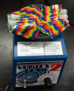 Here are samples of Fryxell mat (colored) and glacier mat (dark) ready for the PowerBiofilm bead beater: Tubes of sharp glass beads to shake in the vortexer.