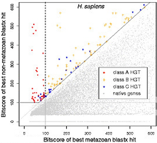 The figure above represents some of the “non-metazoan” sequences found in a human genome. Authors Alastair Crisp, Chiara Boschetti and colleagues identified genes of microbial origin based on their bitscore, that is, how many of the base pairs line up. Class C genes (red) show overall better alignment with microbial genes (threshold score 30) and best match with a particular microbial gene (score 100). Class B genes (blue) show scores of >30 for all orthologs of the gene in other species; orthologs meaning “the same” gene due to shared ancestry. Class A genes (gold) are a subset of class B genes with even poorer homology to genes of metazoan (multicellular) organisms. In contrast, all other garden-variety human genes are shown as gray. But the take-home is that red, blue, and gold genes abound.