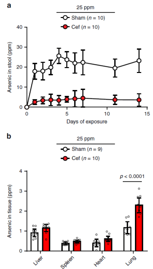 Bacteria may play a huge role. As in Brain Plague, microbial inhabitants actually do collect arsenic and protect us from it. Michael Coryell and other in Seth Walk’s lab at Montana State conducted fascinating experiments with mice. They used mice treated with antibiotics to kill much of their normal gut bacteria. The mice (plus untreated controls) were given drinking water with arsenic. (I know, those cruel scientists.) Antibiotic-treated mice excreted more arsenic in their urine than controls (a). And the antibiotic-treated mice retained more arsenic in their organs (b). Looking at the graph, the (b) result is less convincing than the excretion result, but still intriguing, especially the dramatic difference in the lungs.