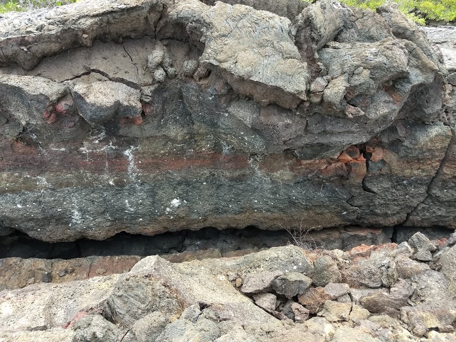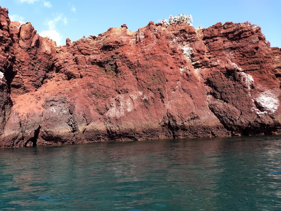 Different islands formed from different offshoots of the magma chamber–where the metals had already separated. The lava forming Rábida Island had 80% iron, which oxidized to red and crumbled into red grains of sand. Here too the animals must adjust.